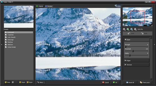 Topaz Clean — плагин для Adobe Photoshop для контроля над глубиной и интенсивностью текстур, границ и деталей изображений для сглаживания, выравнивания, очертания и усиления контуров. Если вы впервые встречаете Topaz Clean, то вы должны знать, что это потрясающий инструмент стилизации изображений, который с легкостью позволит производить различные улучшения над любой картинкой. Новые функции Topaz Clean 3 включают в себя совершенно новый интерфейс, новые пресеты, контроллеры отмены и повтора действий и многие другие возможности.