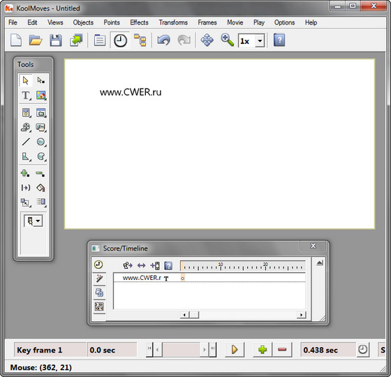 KoolMoves - программа для создания анимационных эффектов в формате Macromedia Flash (.SWF) и кадров для анимированных GIF-файлов и анимации в других популярных форматах. В программе имеется: инструментарий для рисования объектов различной формы, импорт векторной графики, добавление звуковых файлов, множество различных эффектов, в том числе текстовые эффекты, добавление действий к тексту и кадрам. Программа также имеет готовые шаблоны, библиотеку кнопок и векторных заготовок.