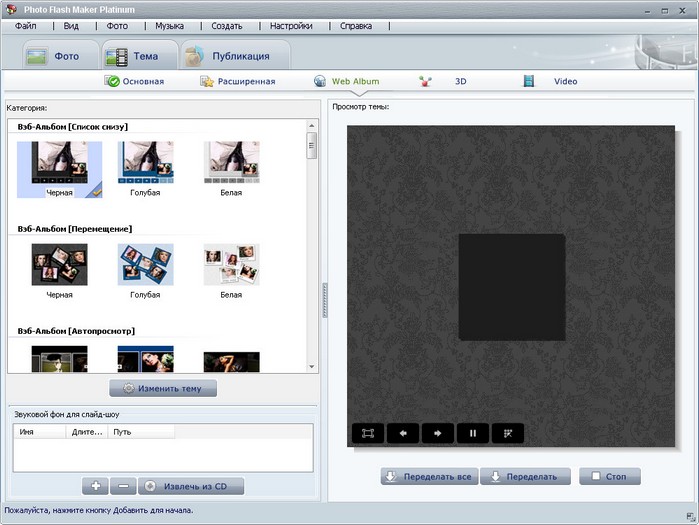 Photo Flash Maker Professional программа для создания анимированного FLASH-слайдшоу из обычных цифровых фотографий. Данная утилита предоставляет более 200 эффектов перехода одной фотографии в другую, имеет различные темы внешнего оформления и позволяет устанавливать музыкальное сопровождение. В настройках утилиты можно указать продолжительность показа отдельной фотографии и время ее перехода в другое изображение.