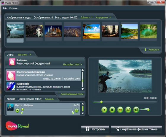 muvee Reveal - позволяет быстро и легко создавать фильмы и слайд-шоу из фотографий и видео. Нужен тем, кто не привык заморачиваться тонкостями видео монтажа. Просто добавьте видео, изображения, любимую музыку и выберите предварительно созданный стиль, все остальное программа сделает сама. Программа поддерживает работу с любыми форматами видео, а также с видео высокой четкости разрешения (1280x720, 1920x1080) и в видео форматами PAL и NTSC. Также позволяет добавить в процессе видео монтажа закадровый текст, музыку.