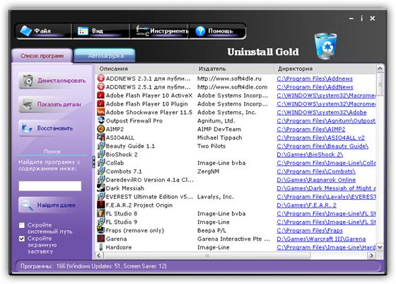 Uninstall Gold - удобная и небольшая по размеру утилита для качественной деинсталляции установленных ранее приложений. Uninstall Gold обладает большим количеством функций: показывает скрытые установленные программы, сортирует список программного обеспечения по заданному фильтру, удаляет некорректно инсталлированные и деинсталлированные программы и многое др...
