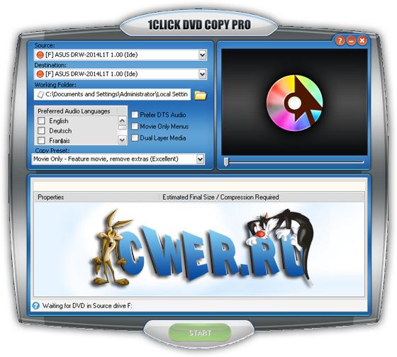 1Click DVD Copy Pro - самая простая и быстрая программа для копирования видео DVD. Благодаря интуитивно понятному интерфейсу подойдёт как начинающим пользователям, так и продвинутым. Возможности программы позволяют переписывать диски с минимальной потерей качества, даже при 40% сжатии копия практически неотличима от оригинала. Программа имеет встроенный движок для записи дисков, позволяет копировать DVD на жесткий диск, выбирать нужные эпизоды. Поддерживаются форматы NTSC и PAL, а также двухслойные DVD. В последней версии была обновлена технология CPRx, добавлены скорости 18x, 20x и 22x для выбора скорости записи вручную.