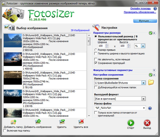 Программа Fotosizer предназначена для пакетной обработки графических изображений, а именно изменения их размеров. Программа позволяет за раз обрабатывать сразу большое количество картинок (целые директории), поддерживаются .JPG, .JPEG, .PNG, .BMP и .GIF форматы.