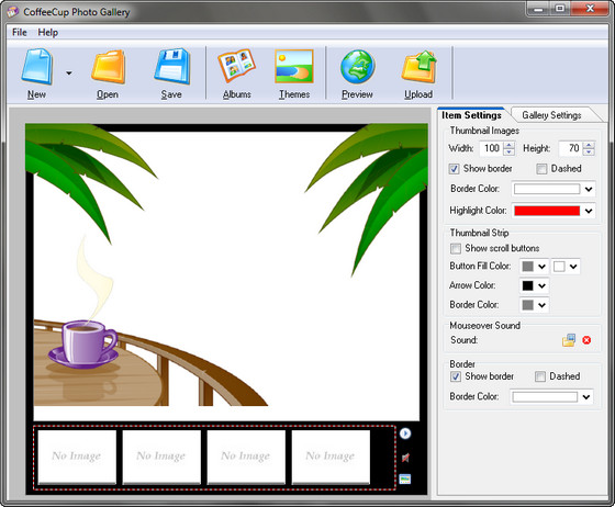 CoffeeCup Flash Photo Gallery - удивительный и простой в использовании альбом для картинок для размещения на Вашем веб-сайте. Программа поддерживает все основные форматы, будь-то .GIF, .JPG, .PNG, .BMP и многие другие. Нет необходимости в знаниях HTML или Flash! Вам достаточно указать программе где вы храните свои картинки и она сделает все за Вас! Flash Photo Gallery автоматически оптимизирует ваши картинки/фотки и загрузит их как уменьшенные копии. Это по настоящему классная программа!