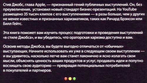 Стив Джобс стал легендой в мире бизнеса не только как сооснователь корпорации Apple, но и как блестящий оратор, чьи презентации всегда заставляли любую аудиторию "сидеть на краешках стульев". Методы и приемы, которые он применяет для завоевания аудитории, изложены в этой книге. Вы можете быть уверены: применив хотя бы некоторые советы Джобса, вы заставите аудиторию прислушаться к вам намного более внимательно.