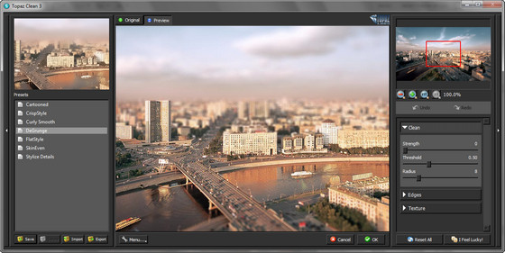Topaz Clean использует уникальный структурный фильтр улучшения изображения, который удаляет шум и одновременно увеличивает четкость краев. Непохожий на большинство современных методов подавления шума, которые в основном базируются на вейвлет-методе, уникальный метод фильтра Topaz Clean™ позволяет достигать отличных результатов без калибровочной камеры для создания “профиля шума” или копаться с большим количеством параметров. Кроме того, он создает резкие края и снижает цветовую размытость контуров. На каналах R, G и B можно использовать различные значения Threshold.