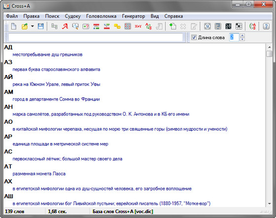 Компьютерная программа Cross+A предназначена для решения кроссвордов, сканвордов, криптарифмов, судоку и японских кроссвордов (черно-белых и многоцветных нонограмм), а также для поиска анаграмм, словосочетаний, цепочек слов и метаграмм.