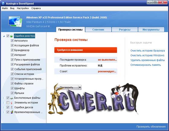 AusLogics BoostSpeed - популярная утилита для ускорения работы системы Windows, программ и Интернет-соединения от компании AusLogics. Программа оптимизирует компьютерную память, ускоряет загрузку Windows, повышает быстродействие Microsoft Office, The Bat, FireFox, Opera, Skype, чистит реестр и диск компьютера. Четвертая версия программы включает в себя знаменитый Auslogics Disk Defrag и набор новых утилит для современных компьютеров. После дефрагментации реестра BoostSpeed, скорость компьютера возрастет за счет уменьшения фрагментации файлов реестра, уменьшения их размера, а также благодаря устранению ошибок в реестре. Помимо этого данная программа предлагает мощные возможности очистки реестра и диска, что в свою очередь позволит вашему компьютеру работать более быстро и эффективно. Имеет приятный пользовательский интерфейс и поддержку русского языка