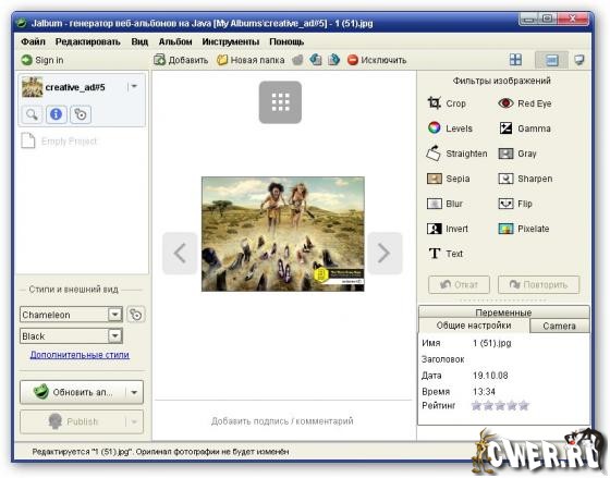Jalbum - программа для автоматического создания веб-галерей. Для этого достаточно мышкой перетащить в окно программы папку с картинками, и она сгенерирует галерею с уменьшенными копиями изображений (или Slide-Show вариант). Впрочем, возможен и ручной режим работы с полным контролем над создаваемым проектом, в том числе с использованием имеющихся фильтров изображений, настройкой стилей, использованием данных IPTC/EXIF и т.п.