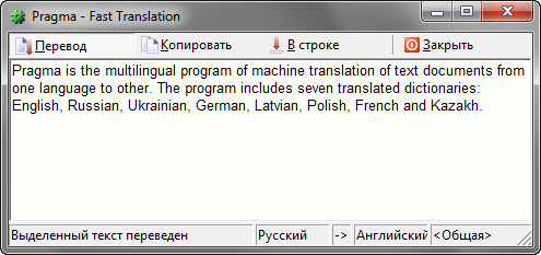 Pragma - это многоязычная программа машинного перевода текстовых документов с одного языка на другой. Программа включает семь переводных словарей: английский, русский, украинский, немецкий, латышский, польский, французский и казахский.