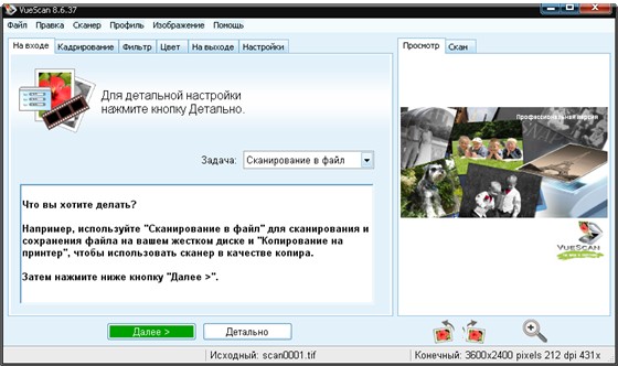 VueScan Pro - программа для работы со сканерами HP, Minolta, Nikon, Polaroid, Epson, Canon и другими. Может работать с внутренней глубиной цвета. VueScan поддерживает автоматическую и ручную настройку большинства параметров и пакетный режим сканирования. Поддерживается более 500 моделей сканеров с определенным перевесом в сторону слайд-сканеров — Nikon, Minolta, Polaroid, Microtek, Epson. Предусмотрено автоматическое удаление дефектов изображения за счет канала инфракрасного сканирования и многопроходное сканирование с последующим усреднением результата — для подавления собственных шумов сканера. Имеются фильтры подавления зерна, нерезкого маскирования и удаления паразитного оттенка оригинала. Есть средства ручной корректировки динамического диапазона и градационной характеристики (независимо по каналам R, G, B).