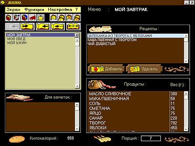 Несмотря на свои невеликие размеры (как для мультимедиа), программа очень насыщена. Она вам и спляшет, и споет, и на гармошке сыграет, и по улице проведет с заходом в приглянувшийся трактир. Достаточно лишь щелкнуть по вывеске. Но главное в ней - это, конечно, рецепты. Свыше 750 блюд русской национальной кухни с указанием калорийности, выхода порций и даже времени приготовления. Умели люди раньше делать - не халтурили.