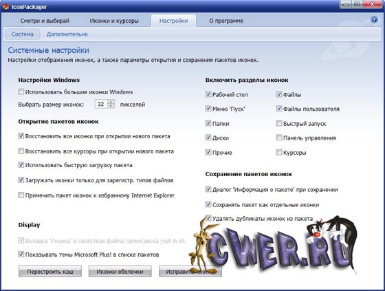 Большинство этих опций очевидно, но имеется и пара параметров настройки, которые являются довольно важными. Обычно никто не знает о том, что значки имеются в наборе только стандартных размеров: 16x16, 32x32 и 48x48. Множество программ не поддерживает другие форматы. Фактически, некоторые не поддерживают даже размер 48x48. IconPackager позволит Вам изменить размер значков в вашей системе на любой, какой Вы пожелаете. Но помните, если это значки не одного из перечисленных 3 размеров, то они могут смотреться нечётко или неправильно.