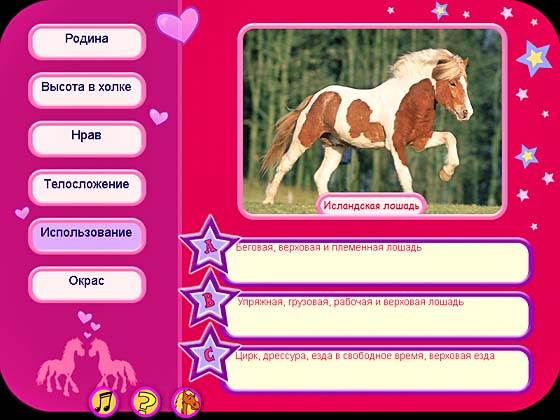 • Интерактивная энциклопедия - изучайте породы лошадей и их особенности, а затем примите участие в викторине!