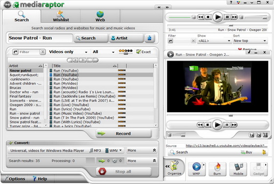 Mediaraptor является аудио и видео-поисковым инструментом, который позволяет найти, музыкальные треки и видео клипы из разных интернет-радиостанций и других источников. Вы можете осуществить поиск по названию или по имени исполнителя, найти новую музыку по жанру и автоматически записывать потоковое медиа во время поиска на YouTube, Google Video и других подобных сайтах. Другие функции включают комплексные средства конвертирования, редактирования ID3 тегов, записи файлов на CD диск и многое другое.