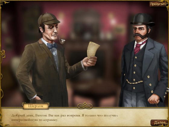 Поприветствуем знаменитую пару сыщиков - Шерлока Холмса и его верного помощника доктора Ватсона. Вновь им предстоит вести расследование самых запутанных преступлений в Лондоне и его окрестностях. Эти преступления не под силу разгадать полицейским из Скотанд-Ярда. И вы имеете уникальную возможность принять участие в поисках и сопоставлении улик и разгадывании запутанных головоломок.