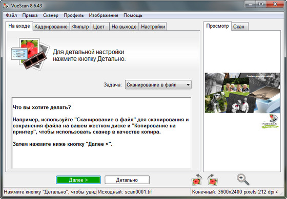 VueScan Pro - программа для работы со сканерами HP, Minolta, Nikon, Polaroid, Epson, Canon и другими. Может работать с внутренней глубиной цвета. VueScan поддерживает автоматическую и ручную настройку большинства параметров и пакетный режим сканирования. Поддерживается более 500 моделей сканеров с определенным перевесом в сторону слайд-сканеров — Nikon, Minolta, Polaroid, Microtek, Epson. Предусмотрено автоматическое удаление дефектов изображения за счет канала инфракрасного сканирования и многопроходное сканирование с последующим усреднением результата — для подавления собственных шумов сканера. Имеются фильтры подавления зерна, нерезкого маскирования и удаления паразитного оттенка оригинала. Есть средства ручной корректировки динамического диапазона и градационной характеристики (независимо по каналам R, G, B).