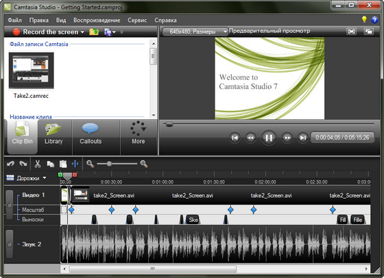 Camtasia Studio - мощная утилита для записи изображения с экрана в видеофайлы различных форматов, имеется возможность редактирования видео, есть встроенные Macromedia Flash (SWF) и видео проигрыватели. Camtasia захватывает действия и звуки в любой части Windows-систем и сохраняет в файл стандарта AVI.