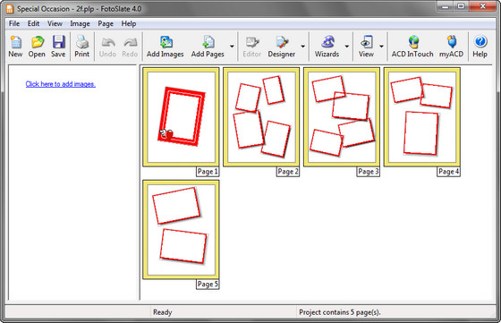 ACDSee FotoSlate 4 Photo Print Studio - удобное приложение для печати цифровых фотографий, имеет большое количество шаблонов и мастеров печати. FotoSlate 4 дает возможность делать простые альбомы фотографий, используя разнообразные шаблоны проектов. В структуре Мастеров открывается Мастер Альбома для вырезок (Scrapbook Wizard), из большого количества многостраничных файлов шаблона выбирается один с подходящим фоном, например, Снегопад, Летние Дни, Осенние Листья, День рождения, Каникулы и т.д., и его текстуры и фоновые изображения страницы применяются в настроенных проектах.