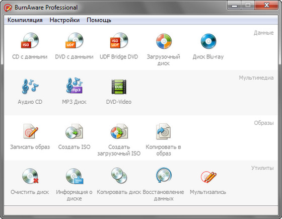 BurnAware Professional - относительно небольшая и простая в использовании программа для записи информации и музыкальных композиций на CD, DVD, Blu-Ray и HD-DVD диски, которая пригодится как опытным пользователям, так и новичкам. BurnAware поддерживает работу со всеми типа оптических дисков (включая CD-R/RW, DVD-R/RW, DVD+R/RW, BD-R/RE, HD-DVD-R/RW и DVD-RAM) и аппаратными устройствами записи. Утилита поддерживает создание образов, способна писать мультисессионные диски, имеет опцию проверки записанного содержимого, работает под операционными системами Windows 98/ME/NT/2000/XP/Vista/7 (32/64-bits).