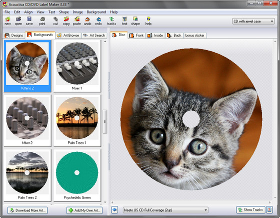 Acoustica CD/DVD Label Maker - одна из самых удачных программ для создания обложек для дисков и рисунков на их поверхности. Эта программа может автоматически помещать на обложку список треков диска, а также использовать для составления такого списка плейлисты программ WinAmp, iTunes, Easy CD Creator и Acoustica MP3 CD Burner. Программа имеет большую библиотеку заготовок для оформления дисков любого содержания – от рождественских песен до дисков с записью видео со свадьбы, дня рождения, летних каникул и т.д. Готовые шаблоны можно редактировать по своему усмотрению, добавляя на них текстовые эффекты. В том числе поддерживается создание надписей по ободку диска. Для неопытных пользователей предусмотрено создание обложек при помощи пошагового мастера.