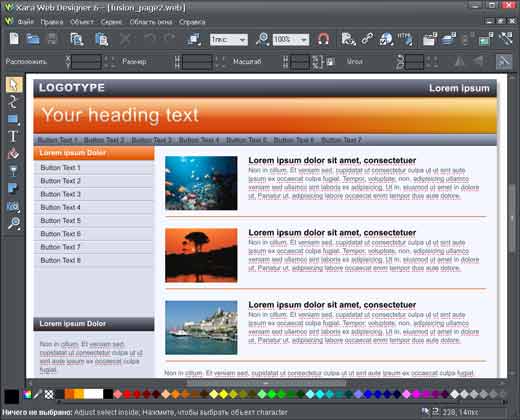 Xara Web Designer позволяет с легкостью решать задачи, с которыми не способны справиться другие аналогичных продукты, например, организовать «обтекание» текстом графических элементов и изображений нестандартной формы. А включенные в состав пакета инструменты для работы с векторной графикой позволят вручную рисовать объекты любой степени сложности, от элементарных геометрических фигур до сложных корпоративных логотипов. Профессионалам веб-дизайна Xara Web Designer может очень пригодиться в быстром прототипировании сайтов - всего полчаса, и у вас будет готовый предварительный макет с поддержкой всех основных функций. К уникальным возможностям пакета Xara Web Designer можно отнести и автоматическую подгонку размера графических элементов под вводимый текст.