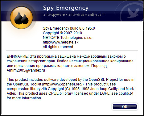 Spy Emergency - программное обеспечение, которое быстро и безопасно находит и удаляет шпионские модули, программы-рекламы и другие вредоносные программы из вашего компьютера. Вы боитесь хакеров или шпионские программы, тогда установите данную программу и будьте уверены, что вы защищены от вмешательства в ваши личные дела, связанные с компьютером. Программа сканирует системную память, реестр, отдельные директории, файлы кукисов в поиске вредоносных программ и шпионских модулей. Утилита в реальном времени анализирует и защищает память компьютера. Интерфейс программы ненавязчив и прост, а функциональность и быстродействие программы просто поражают воображение. Имеется мультиязычная поддержка, включая поддержку русского языка.