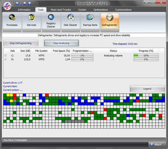 EnhanceMySe7en включает в себя менджер автозагрузки, менеджер процессов, модуль очистки жесткого диска, дефрагментатор жесткого диска, "чистильщик" системного реестра, монитор жесткого диска (температура, время работы, серийный номер и т.п.), модуль настройки интернет-соединения, а также средства для быстрого доступа к "тонким" настройкам операционной системы.