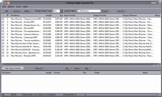 FairStars Audio Converter Pro - профессиональный инструмент для конвертации аудио файлов самых разнообразных форматов (WAV, RealMedia (RM, RA, RMVB, RMJ), AIFF, AU, Creative VOC, PVF, PAF, Amiga IFF/SVX, APE, FLAC, OGG, VQF, MP1, MP2, MP3, WMA, WMV, ASF, MP4, M4A, M4B, AAC to WMA, MP3, AAC, VQF, OGG, FLAC, APE, WAV). Кроме этого утилита позволяет нормализовать композиции по звучанию, улучшить качество воспроизведения, имеет встроенный плеер и позволяет редактировать ID3 теги.