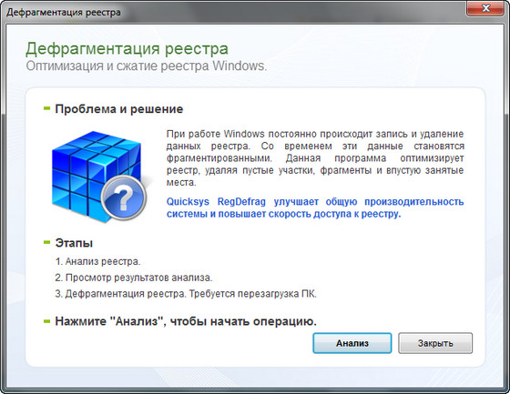 Программа для дефрагментации реестра. Quicksys RegDefrag позволяет в целом улучшить работу компьютера и повысит скорость доступа к реестру. Данные в реестре постоянно перезаписываются, удаляются и добавляются во время работы операционной системы. Через некоторое время эти данные становятся дефрагментированными. Quicksys RegDefrag оптимизирует файл реестра, удаляя из него пустые места, отдельное фрагменты и потраченное впустую место.