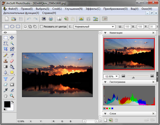ArcSoft PhotoStudio - полнофункциональный пакет для обработки цифровых фотографий. В этом пакете собрана целая коллекция инструментов для редактирования и ретуширования фотографий в совокупности со средствами создания и наложения различных эффектов. Программа позволяет улучшать качество цифровых фотографий, убирать эффект "красных глаз", создавать анимированный 3D текст, поддерживает работу со слоями, позволяет подготавливать и распечатывать цифровые фотографии, содержит более 40 специальных эффектов (Oil Painting, Watercolor, Charcoal, Wet brush, Pastel, Impressionistic, Neon Edges, Bulge, Pinch, Stretch, Magic Mirror, Mosaic, Splash, Texture, Cool и т.д.)