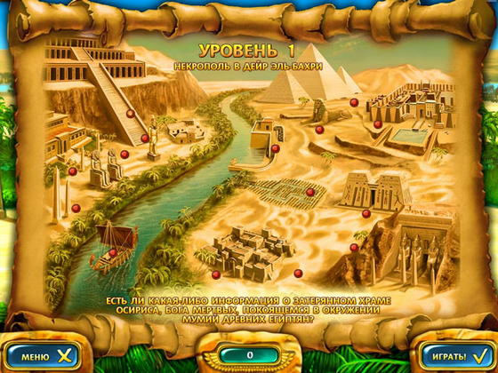 Откройте для себя чудеса древнего и загадочного Египта! Помогите путешественнику Динфилду отыскать заброшенный храм. Преодолевая опасности, подстерегающие странника в раскаленной пустыне и наслаждаясь красотой цветущих берегов Нила, вы найдете дорогу к величественным пирамидам. Используйте свой ум и способности к логическому мышлению, чтобы правильно скомбинировать иероглифы в этом увлекательном маджонге!