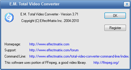 E.M. Total Video Converter - это очень мощная программа, которая позволяет конвертировать любые видеофайлы в форматы 3gp (формат мобильных телефонов и наладонников), mp4, psp, iPod, swf, flv, DVD, VCD. Total Video Converter поддерживает чтение и проигрывание большого количества видео и аудио форматов (3gp, mp4, psp, iPod, swf, flv, DVD, VCD, mp3, ac3, ogg, wav, aac...), а также конвертирует их в популярные video/audio форматы и форматы мобильных телефонов и наладонников. Присутствует возможность извлечения аудио из видеотреков и сохранение в mp3, ac3, ogg, wav, aac.