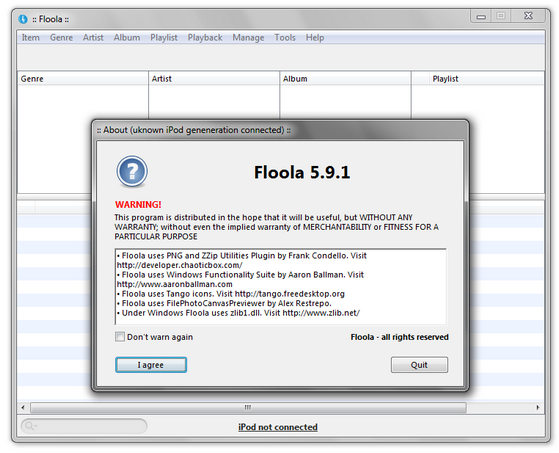 Floola - программа для управления iPod и телефонами Motorola. Позволяет редактировать и синхронизировать данные с компьютером. Кроме этого, Floola позволяет отыскивать продублированные композиции, конвертировать файлы из одного формата в другой, а также работать с подкастами (для этого достаточно добавить URL). Имеется возможность интеграции с популярными веб-сервисами (YouTube, Last.fm).
