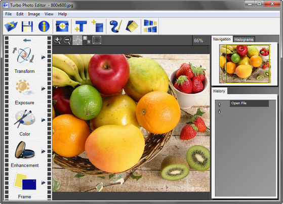 Turbo Photo состоит из двух частей: редактора и фотоальбома для организации, просмотра и распечатывания снимков. Turbo Photo позволяет устранить "шум" с фотографии, избавиться от дефектов кожи, добавить на снимки рамки и надписи, сохранить набор изображений в виде слайд-шоу. Поддерживается обработка фотографий в пакетном режиме.