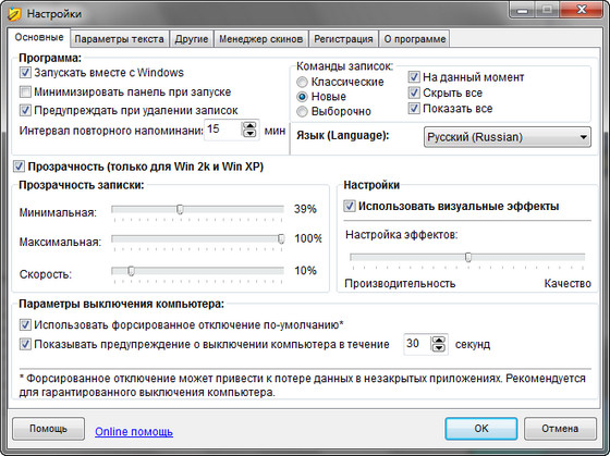Отдельно хочется рассказать о настройке утилиты Power Notes. Дело в том, что при использовании рассматриваемой утилиты пользователь может самостоятельно задать шрифты записок и параметры печати, включить запуск программы вместе с Windows и установить степень прозрачности стикеров. Кроме того, в окне настроек можно выбрать проигрываемые для основных событий звуки, включить случайный выбор цветовой схемы и местоположения на экране "наклейки" при ее создании, настроить "горячие" клавиши, с помощью которых пользователь сможет быстро создавать новые стикеры, вызывать редактор, а также окно настроек рассматриваемой утилиты. Кроме того, среди параметров программы есть пункты, отвечающие за ее внешний вид. Так, например, пользователь может выбрать скин главной панели, а также язык интерфейса.