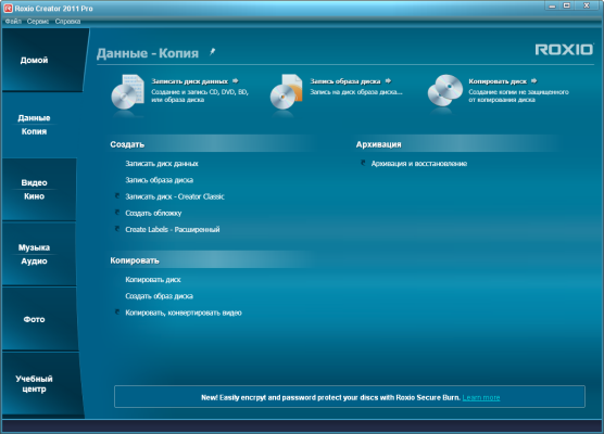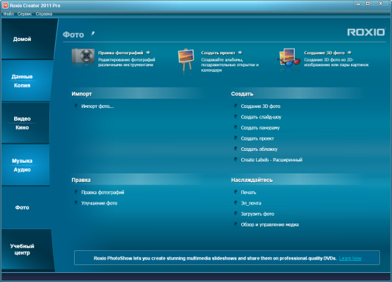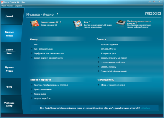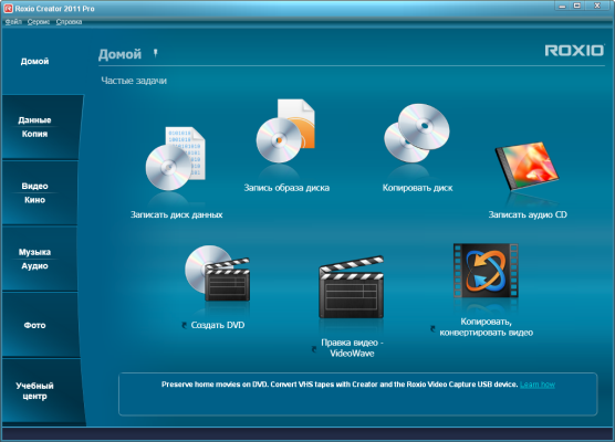 Roxio Creator 2011 Pro представляет собой решение для записи, редактирования и публикации персональных видеоматериалов, включая записи высокой четкости. Приложение обеспечивает запись дисков, резервное копирование данных, преобразование записей с разных носителей в формат MP3, редактирование аудиозаписей, создание меню для DVD, поддержку стандарта Blu-ray и высокую скорость кодирования видеопотока благодаря применению технологий ATI Stream и NVIDIA CUDA.