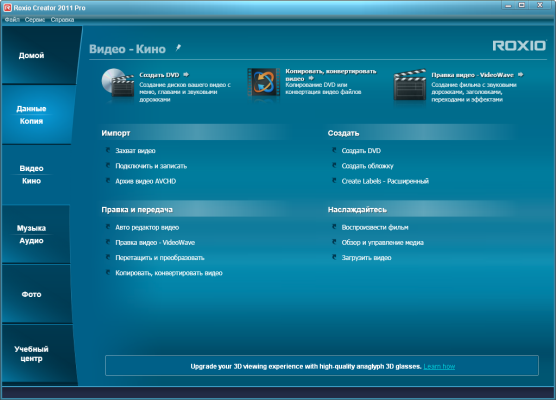 В новой версии пакета приложений появилась возможность конвертирования обычных фотографий и видеороликов в 3D-содержимое. Roxio Creator 2011 поддерживает 3D-форматы, которые используются в современных трехмерных фильмах, а также разнообразные устройства, предназначенные для работы с таким контентом. Пользователи программы могут импортировать стереоскопическое содержимое прямо из 3D-камер и других устройств захвата и затем создавать собственные 3D-проекты с эффектами перехода, титрами, фильтрами и звуковой дорожкой.