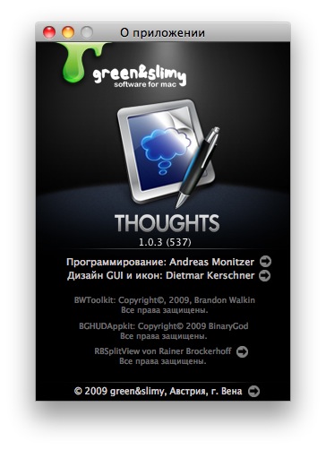 Компания Green&Slimy выпустила новый органайзер Thoughts, который по своему элегантному исполнению можно поставить в один ряд с такими программами, как Things, Tweetie, CleanMyMac или DaisyDisk.