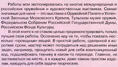 В мире есть три вещи, созерцание которых доставляет человеку удовольствие и никогда не наскучит — это вид воды в движении, огонь (если не горит твой дом) и то, как работает человек. Мастер своего дела. Предлагаем уважаемому читателю удивительную книгу тульского художника-оружейника Олега Семенова. Удивительна эта книга тем, что она не о произведениях оружейного искусства современных мастеров, а о том "как это делается".