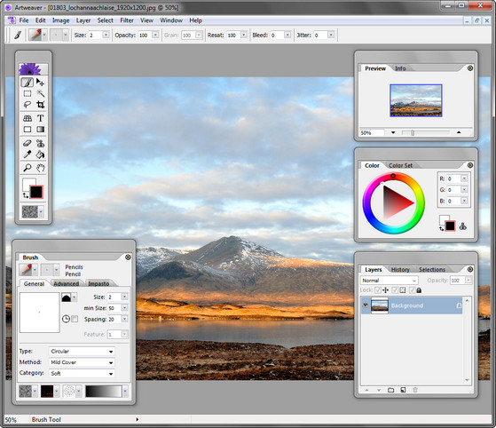 Artweaver по внешнему виду напоминает Photoshop - те же панели истории и слоев, палитра инструментов, область предварительного просмотра. Однако, в отличие от графического редактора от Adobe, эта программа содержит только инструменты для рисования. Используя их, можно раскрашивать изображения кистями, добавлять текст, заливку и градиент, рисовать линии, производить обрезку и т.д. Есть даже инструменты "штамп" и "волшебная палочка". Artweaver содержит очень удобные средства для выбора цвета: его можно выбирать как на цветовом круге, так и из набора наиболее часто используемых цветов. Одним словом, это отличная программа для детей и начинающих художников.