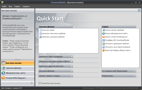 DownloadStudio - это универсальный комбайн для скачивания файлов и сайтов из Интернета. С ее помощью вы можете скачивать файлы в многопотоковом режиме, закачивать отдельные страницы или целые сайты для просмотра их в offline-режиме, а также осуществлять захват видеоизображения с экрана компьютера. Использование данной программы позволит вам отказаться от установки на компьютер программ, выполняющих все вышеперечисленные функции раздельно.