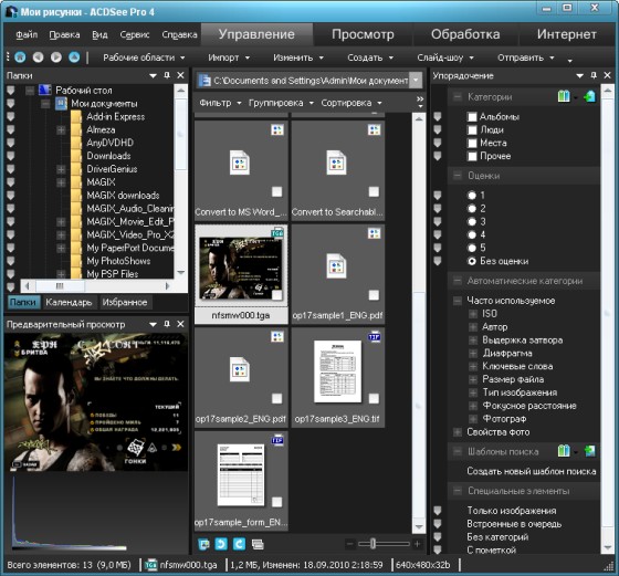 ACDSee Pro - профессиональная программа для работы с цифровыми фотографиями, которая обладает расширенным набором функций, рассчитанных на профессиональных фотографов. Поддерживает более 100 форматов графических файлов, позволяет работать с RAW-изображениями, автоматически сортировать фотографии по параметрам, полученным из цифровых фотокамер, содержит эффективный визуальный метод добавления к изображениям метатегов и быструю пакетную обработку большого количества картинок, в том числе и в RAW формате. Кроме того, здесь присутствуют инструменты для независимого регулирования цветовых каналов, исправления артефактов фотографий, появляющихся из-за погрешностей оптики, добавления "водяных знаков", работы с IPTC-метаданными, имеется возможность архивирования графических коллекций в ZIP-файлы, запись на CD или DVD и многое другое.