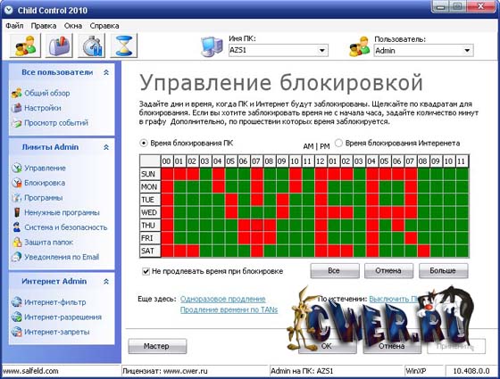 Salfeld Child Control - программа ограничивает время, проводимое вашими детьми за компьютером, как только выделенное им время закончится, компьютер автоматически выключится и повторный вход будет возможен только после ввода пароля. Ограничение можно ввести как по общему времени (например, не более 1 часа в день), так и по периоду времени, когда можно работать (например, с 22:00 до 8:00 доступ запрещен). Кроме этого, программа позволяет запретить посещение нежелательных сайтов, а также заблокировать доступ к определенным дискам и папкам.