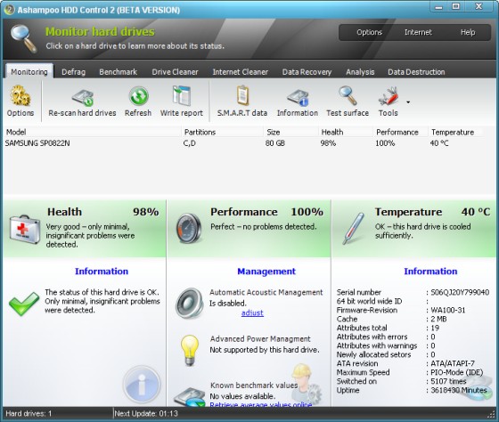 Ashampoo HDD Control - программное обеспечение для контроля за состоянием жестких дисков. Выполняет обслуживание жесткого диска для Вас. Позволяет предотвратить потенциальные отказы и аварии прежде, чем они произойдут. Программное обеспечение поддерживает жёсткие диски типа IDE и последовательные ATA. Ashampoo HDD Control предоставляет пользователю все важные факты и информацию о дисководе, включая регистрационный номер, версию БИОСА (прошивки), размер кэша, количество разделов, на которые разбит хард, свободном месте на диске и текущей температуре.