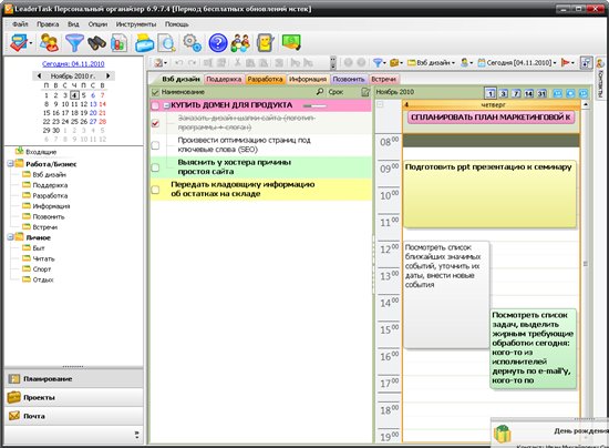 LeaderTask - это умный органайзер для лидеров! Интеллектуальная система управления проектами, событиями, задачами, контактами, освободит вас от рутины и даст больше времени для творчества. LeaderTask поможет вам избавиться от различных поглотителей времени, поможет вам увидеть четкую перспективу жизни, иметь подробный обзор дел, задач, вы будете ставить более высокие цели и достигать их. Кроме того, LeaderTask - это еще и удобный менеджер проектов, с помощью которого можно легко планировать и управлять вашими личными делами, а также бизнес проектами.