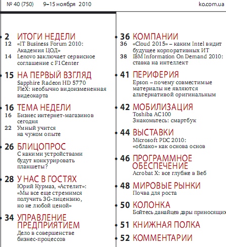 Еженедельное издание, нацеленное на профессионалов в области IT, занятых разработкой, продажей и внедрением IT-продуктов и услуг. Журнал содержит новости и статьи о самых новых технологических разработках, описания и результаты тестов новых продуктов, аналитические материалы, обзоры рыночной ситуации в различных сегментах IT-индустрии, как в Украине, так и за рубежом.