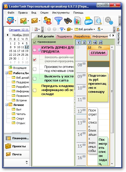 LeaderTask - это умный органайзер для лидеров! Интеллектуальная система управления проектами, событиями, задачами, контактами, освободит вас от рутины и даст больше времени для творчества. LeaderTask поможет вам избавиться от различных поглотителей времени, поможет вам увидеть четкую перспективу жизни, иметь подробный обзор дел, задач, вы будете ставить более высокие цели и достигать их. Кроме того, LeaderTask - это еще и удобный менеджер проектов, с помощью которого можно легко планировать и управлять вашими личными делами, а также бизнес проектами.