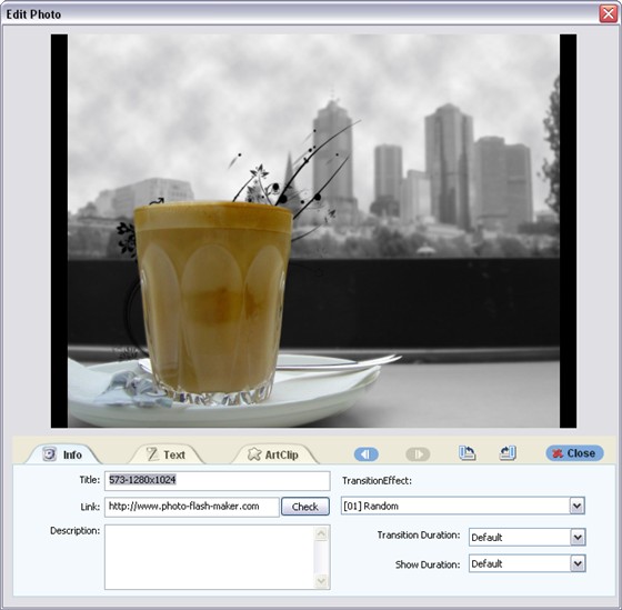 Photo Flash Maker Platinum - программа для создания анимированного FLASH-слайдшоу из обычных цифровых фотографий. Данная утилита предоставляет более 200 эффектов перехода одной фотографии в другую, имеет различные темы внешнего оформления и позволяет устанавливать музыкальное сопровождение. В настройках утилиты можно указать продолжительность показа отдельной фотографии и время ее перехода в другое изображение.