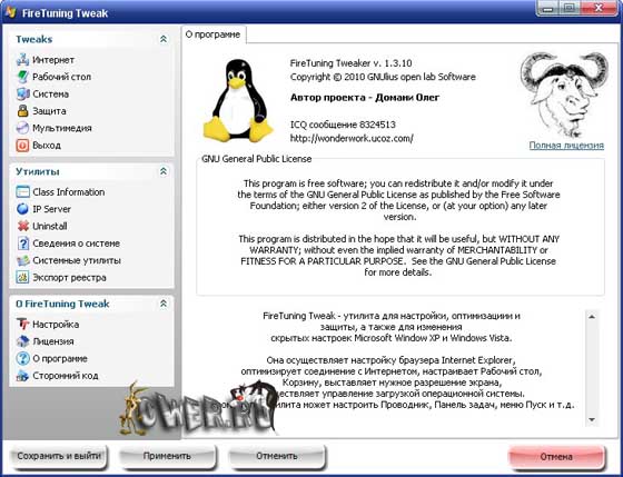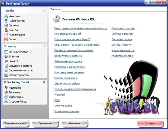 Утилита для настройки, оптимизации и защиты, а также для изменения скрытых настроек Window XP и Windows Vista. Она осуществляет настройку браузера Internet Explorer, оптимизирует соединение с Интернетом, настраивает Рабочий стол, Корзину, выставляет нужное разрешение экрана, осуществляет управление загрузкой операционной системы. Кроме того, утилита может настроить Проводник, Панель задач, меню Пуск и т.д.
